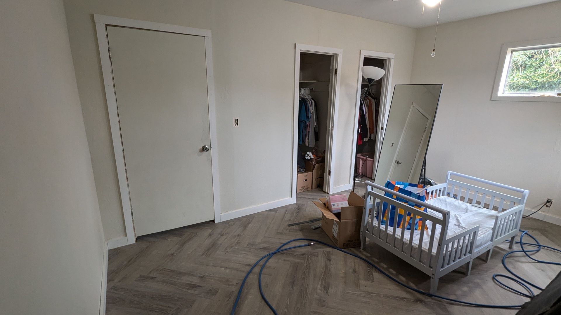 After installing new underlayment, we installed a beautiful LVP in a herringbone pattern, connecting both bedrooms and the hallway in-between.